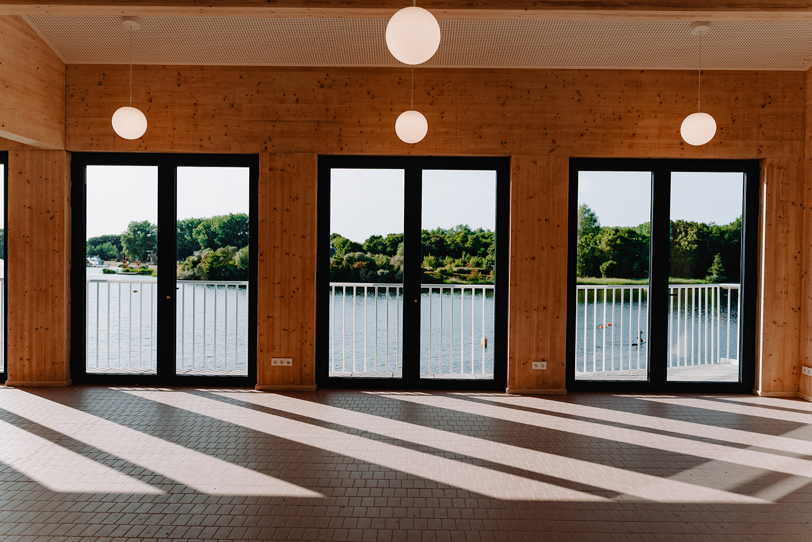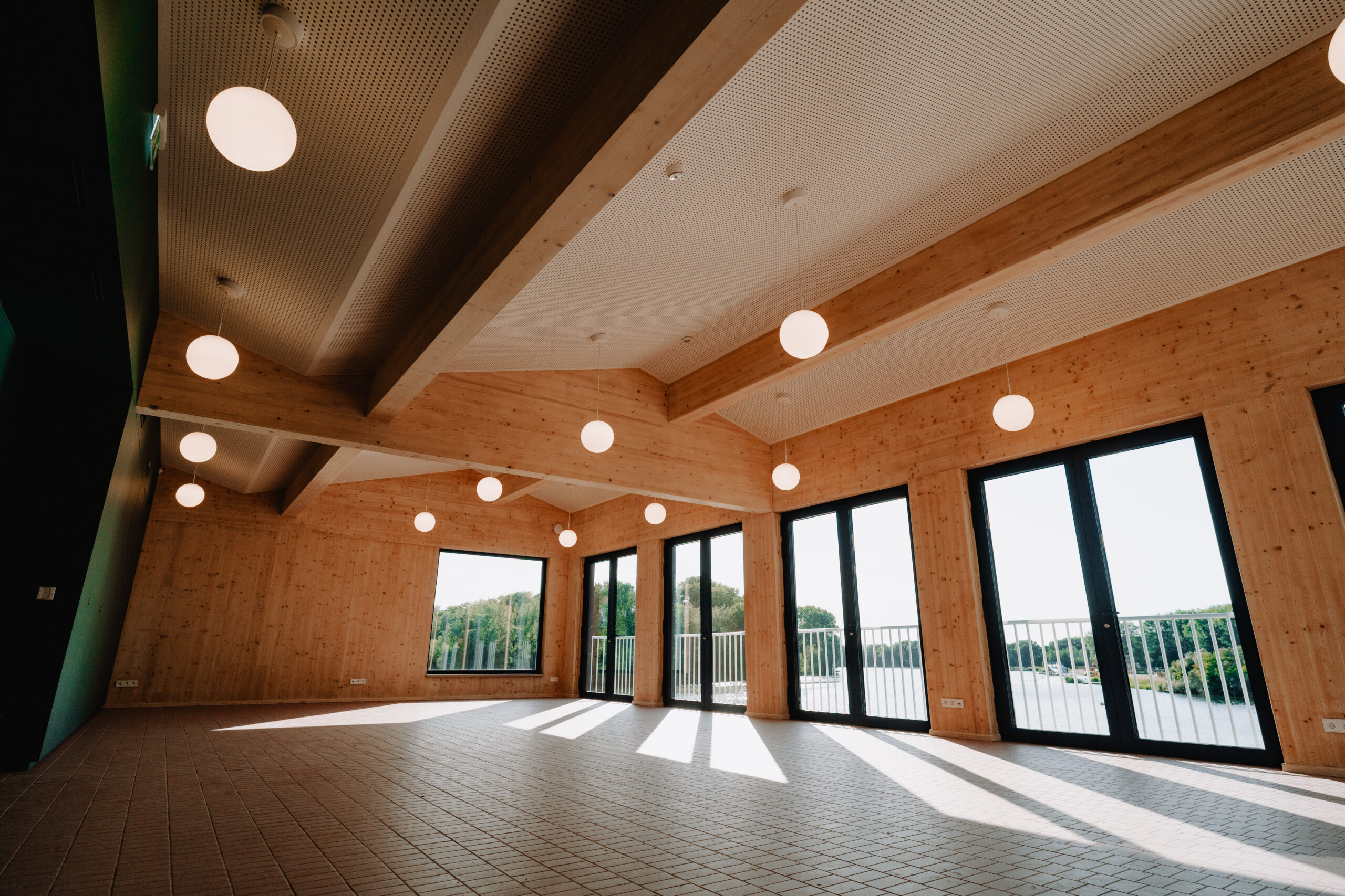 Onze Bel etage (1ste verdiep, er is ook een lift!) is een ruime, heel flexibel in te richten polyvalente ruimte. Met ruimte voor partytafels, eettafels, … En zicht op het meer natuurlijk.